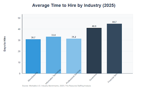 Slow hiring also adds cost. Companies spend roughly $4,700 per hire, and vacant roles reduce productivity. When a hire fails, it can cost up to 30% of that employee’s first-year pay. Recruiting costs can even reach several times the salary for hard-to-fill roles.